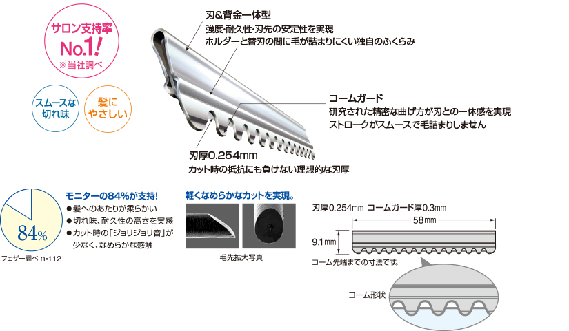 替刃とコームガードが一体のため、安心して使えるヘアカット専用レザー替刃。刃の装着しやすさと安定性もアップ!フェザースタイリングレザー、レザーWに対応。