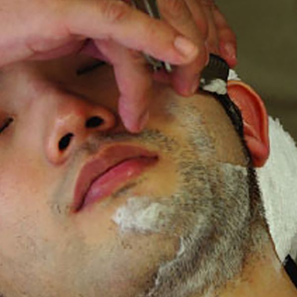 鋭利な刃を直接肌にあてるシェービングは理容師にしかできない高等技術。レザーの持ち方、ラザーリング、正剃り、逆剃りなど基本的な技術を一から会得できる。