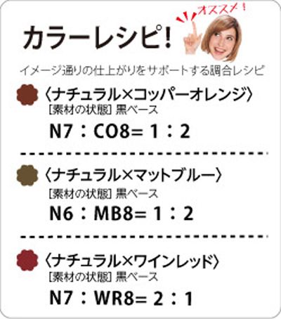 髪の主成分であるケラチンPPTや栄養分を補うウィートプロテインをたっぷり配合し、傷みを抑えたなめらかな手触りとカラーが長期間楽しめる。またハーブや生薬を配合し頭皮への刺激を抑えた低刺激性、低アルカリ処方によりカラー剤特有の臭いが気にならない。
