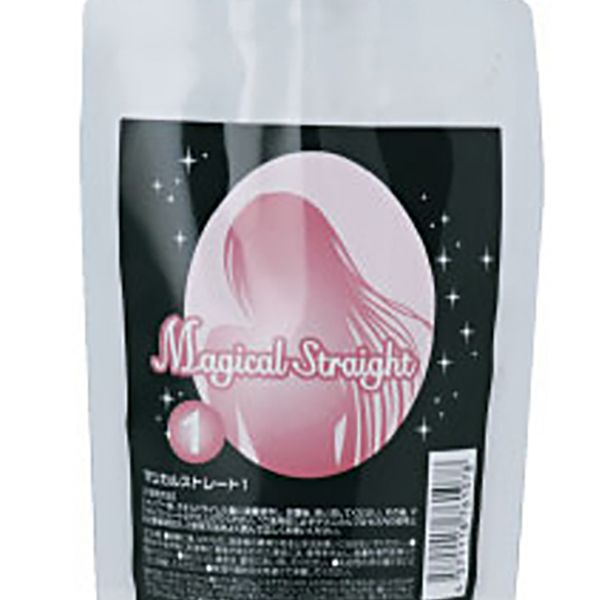 マジカルストレート1を塗布、15分程度加温後、水洗して乾かす。180℃に設定したアイロンで、髪を伸ばす。その後、マジカルストレート2を塗布して15分程度放置後、水洗して仕上げる。