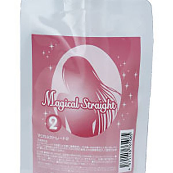 マジカルストレート1を塗布、15分程度加温後、水洗して乾かす。180℃に設定したアイロンで、髪を伸ばす。その後、マジカルストレート2を塗布して15分程度放置後、水洗して仕上げる。