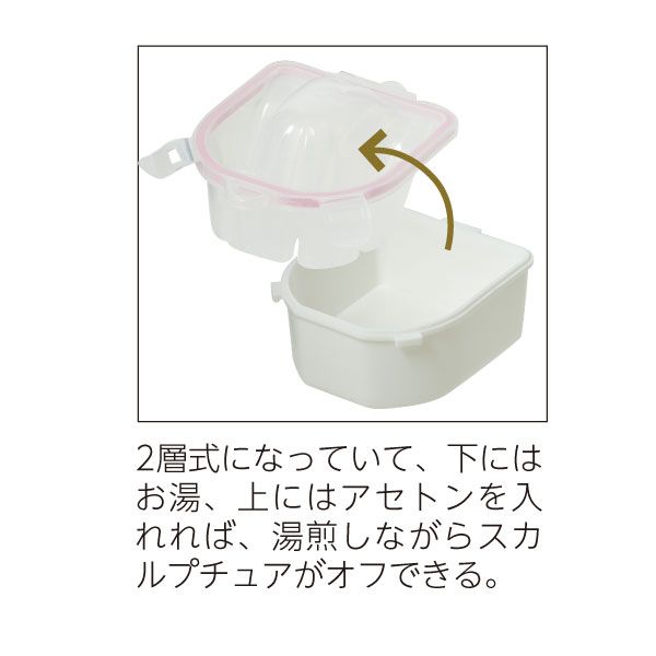 2層式になっていて、下にはお湯、上にはアセトンを入れれば、湯煎しながらスカルプチュアがオフできる。
