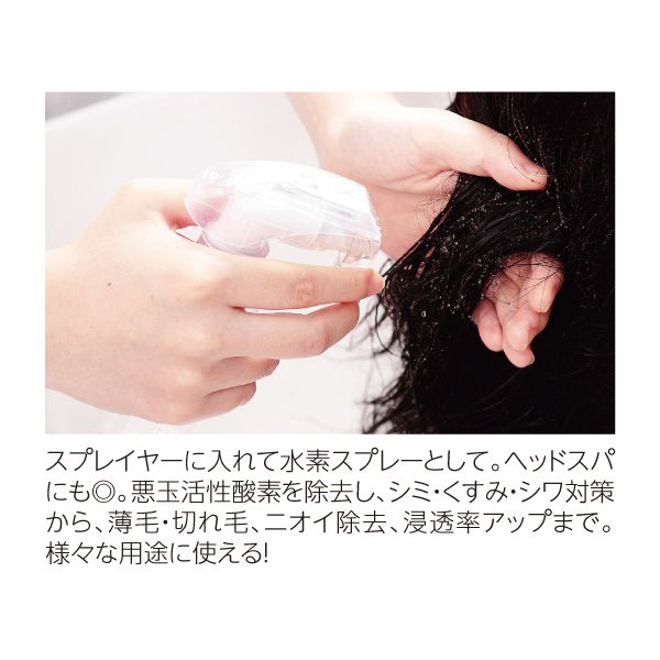 ヘッドスパはもちろん、スプレイヤーに入れて水素スプレーとして使用する等、どんなシーンにも対応可能。