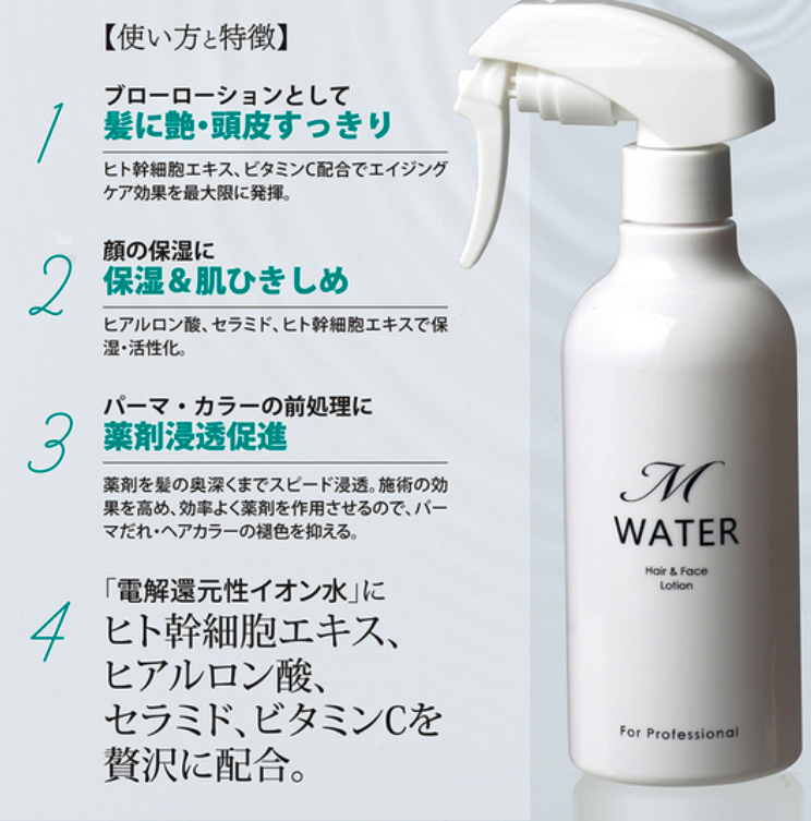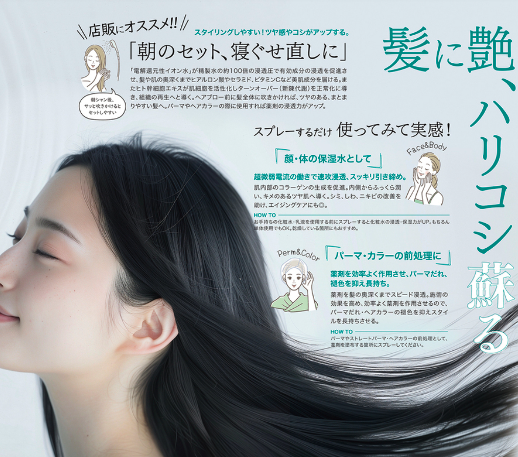 電解還元性イオン水が肌の角質層まで届く。肌に潤い、ハリを与える。髪にはツヤを与え、頭皮をすっきりさせる。