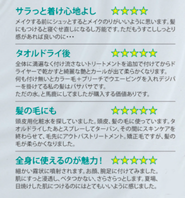 また、ヒト脂肪細胞順化培養液エキス配合で肌や髪をイキイキさせる。身体のめぐりをサポートし本来の潤いやハリを取り戻す。