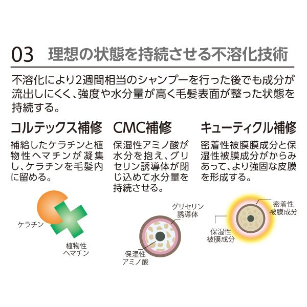 不溶化により2週間相当のシャンプーを行った後でも成分が流出しにくく、強度や水分量が高く毛髪表面が整った状態を持続する。