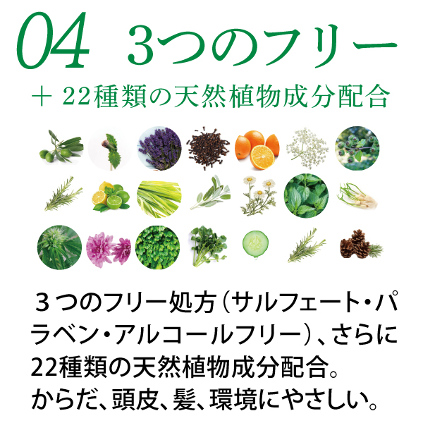 サルフェートフリー、パラベンフリー、アルコールフリーでからだ、頭皮、髪、環境にやさしい。