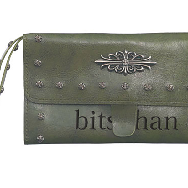 クロス型のパーツがハードなデザイン。ボタン式開閉で開きやすく使いやすい。