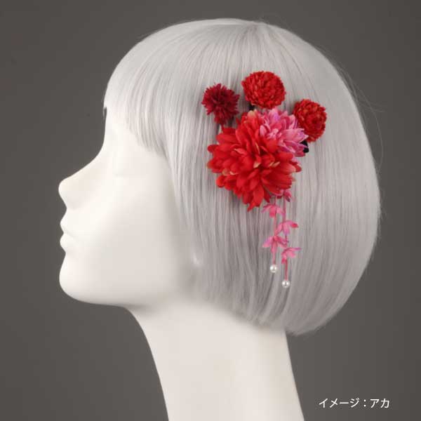 ダリアの花とポンポン丸い菊の小花が、華やかな印象を与える髪飾り。