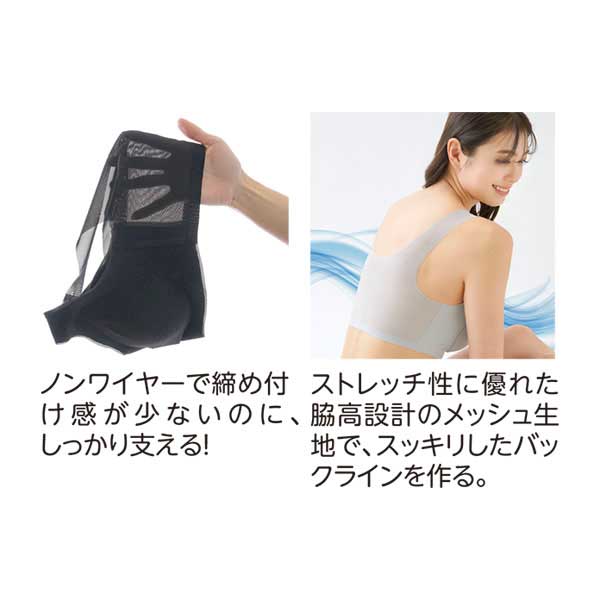 全面エアーホール構造のエアースルーパッド内蔵。下厚構造でバストを寄せて支える。