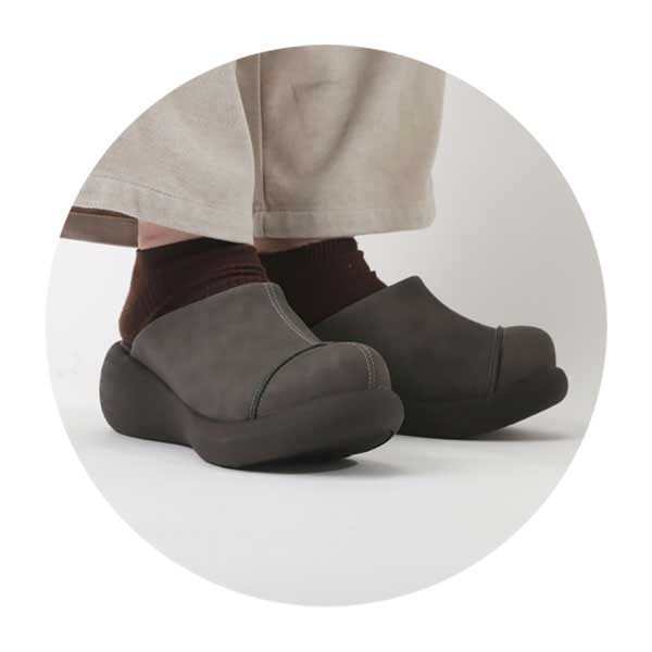 気持ちよく足になじむ、やわらかい履き心地。コロンとしたかわいいソールは少しの体重移動で体が前に進み、