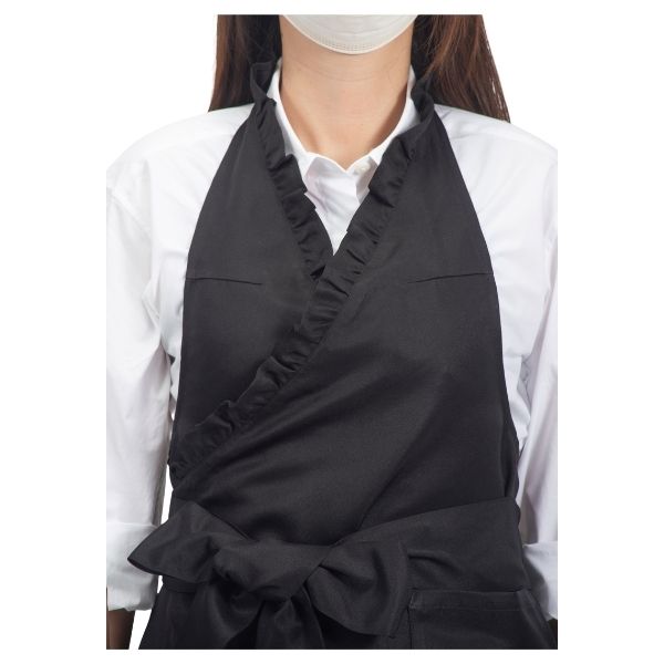 自然に広がるフリルと大きなリボンが印象を際立てる、フリルエプロン。