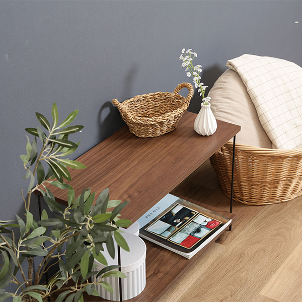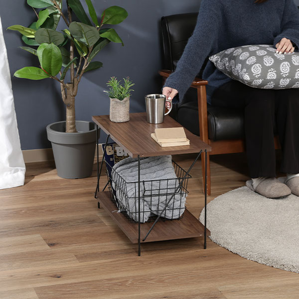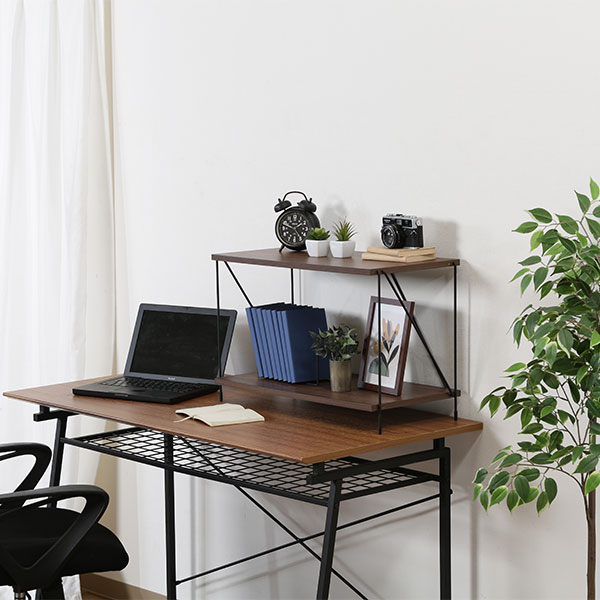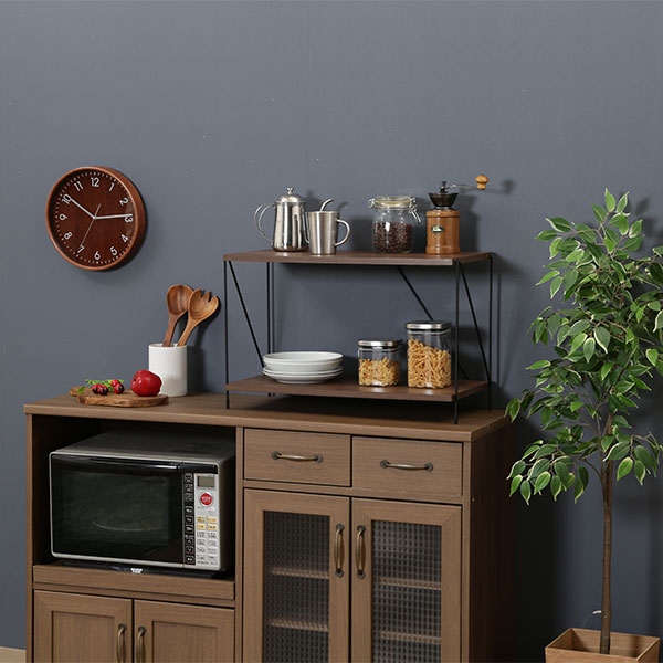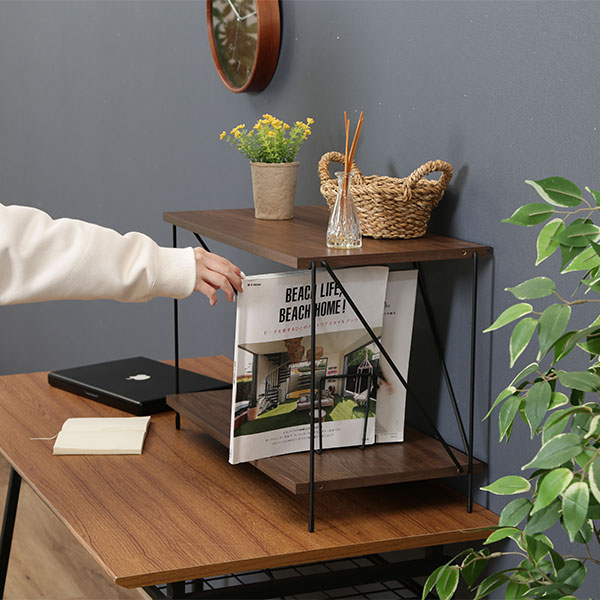 スタイリッシュなデザイン。木目調の棚板とブラックスチールのワイヤーフレームで、空間をカッコよく見せる。