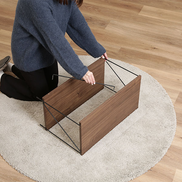 棚板の穴にワイヤーフレームを差し込むだけで簡単に組み立てできる。