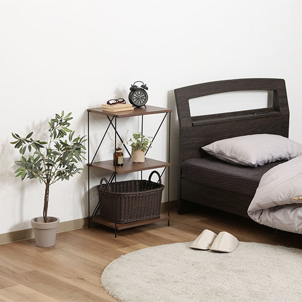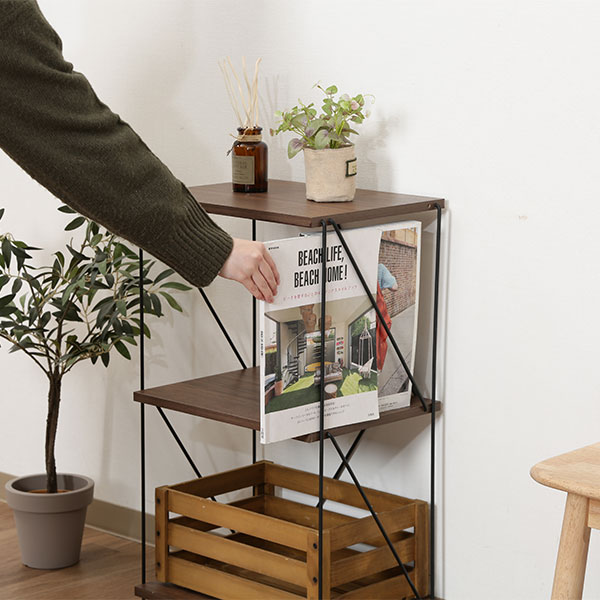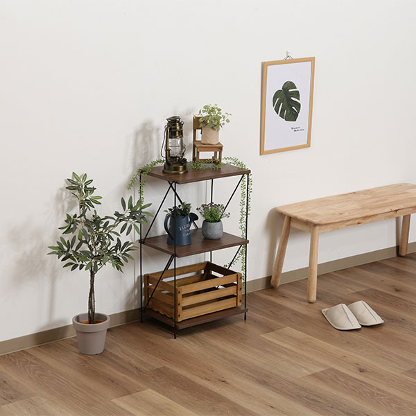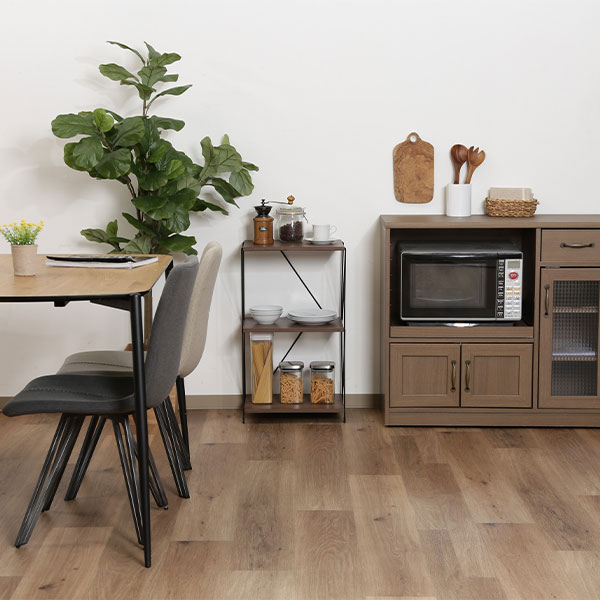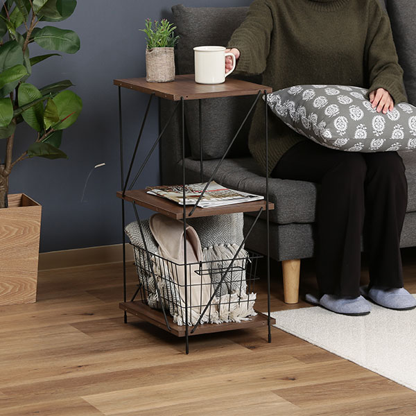 スタイリッシュなデザイン。木目調の棚板とブラックスチールのワイヤーフレームで、空間をカッコよく見せる。