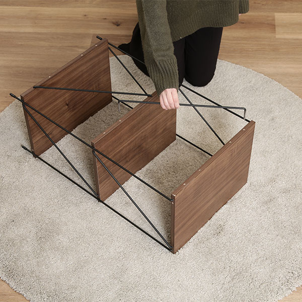 棚板の穴にワイヤーフレームを差し込むだけで簡単に組み立てできる。