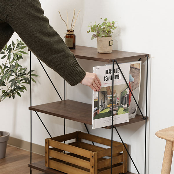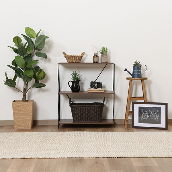 スタイリッシュなデザイン。木目調の棚板とブラックスチールのワイヤーフレームで、空間をカッコよく見せる。