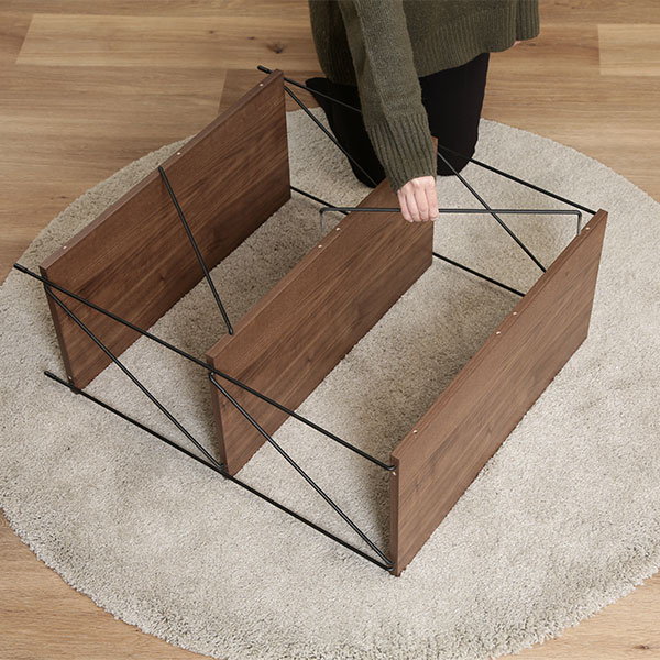 棚板の穴にワイヤーフレームを差し込むだけで簡単に組み立てできる。