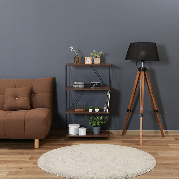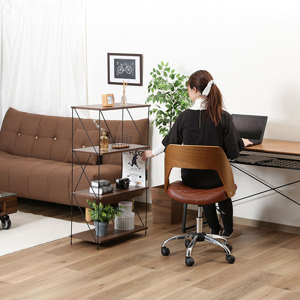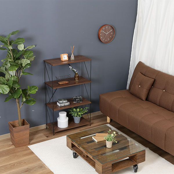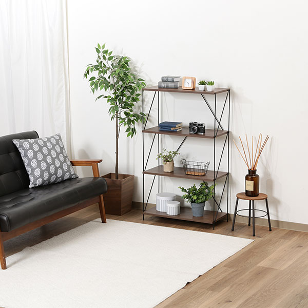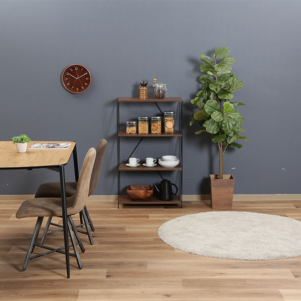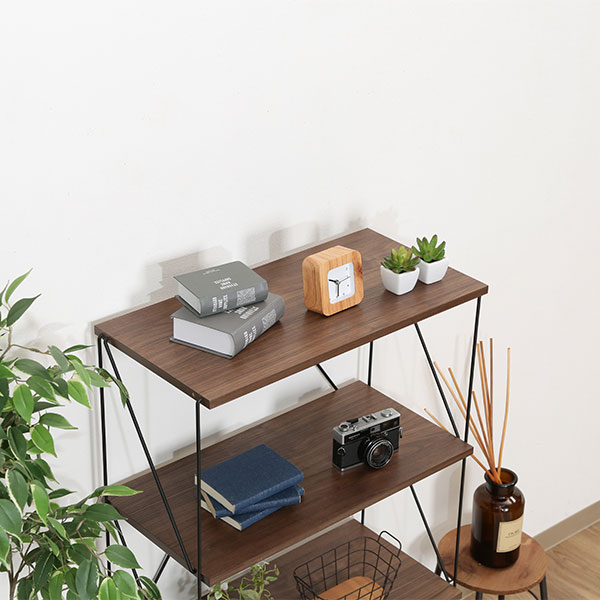 スタイリッシュなデザイン。木目調の棚板とブラックスチールのワイヤーフレームで、空間をカッコよく見せる。