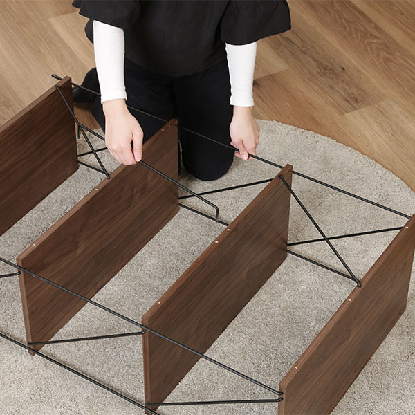 棚板の穴にワイヤーフレームを差し込むだけで簡単に組み立てできる。