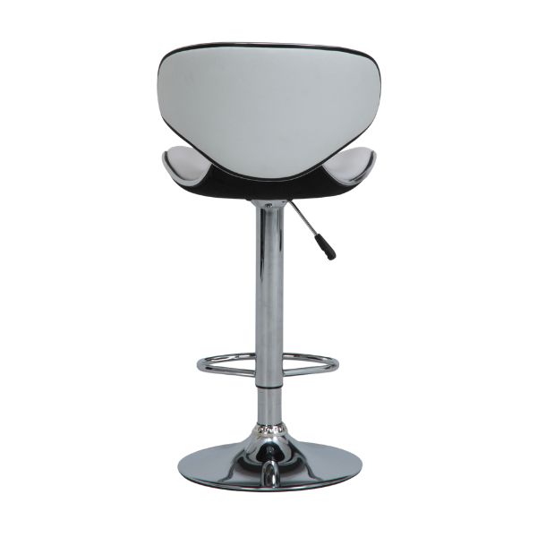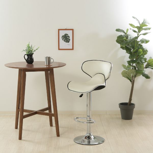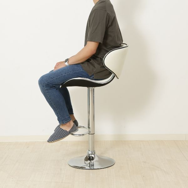 レバーで高さ調節(61?82cm)が可能な360度回転式座面とフットレスト付きのチェアは、撥水性のあるPUレザーを使用し、汚れに強くお手入れも簡単。