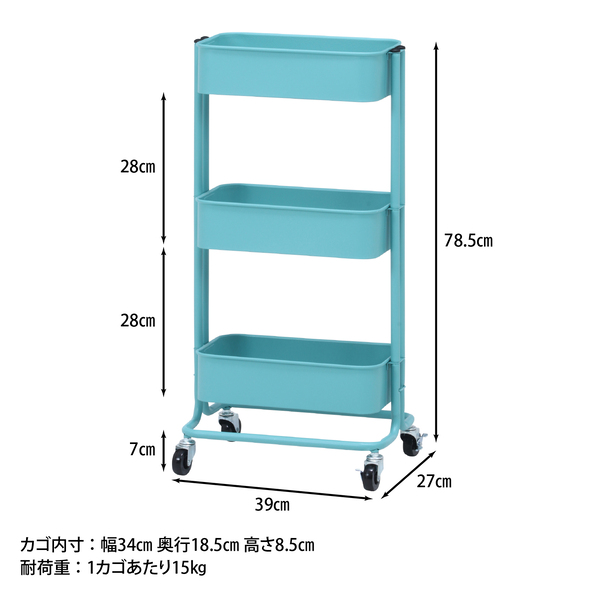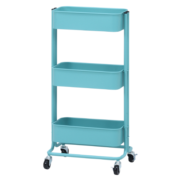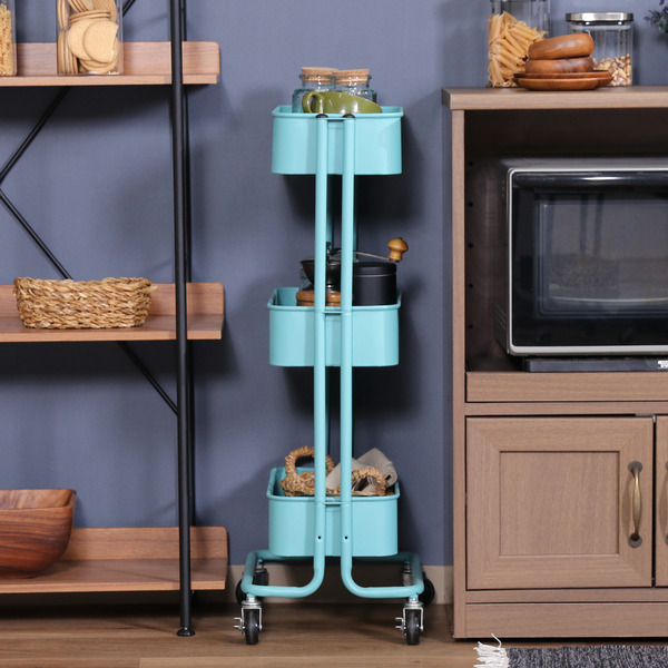 キッチンワゴン バスケット3段 スリム ターコイズブルー