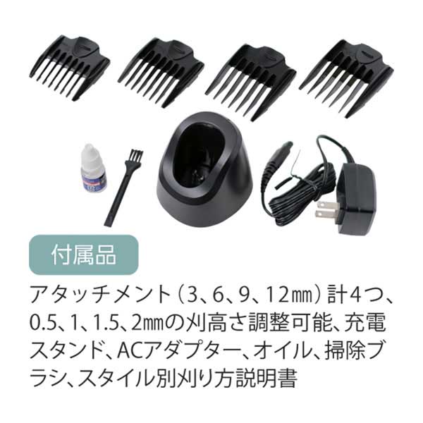 ●付属品:刈り高さアタッチメント4個(3・6・9・12mm)、充電スタンド、スタイル別刈り方説明書、オイル、掃除ブラシ、ACアダプター
