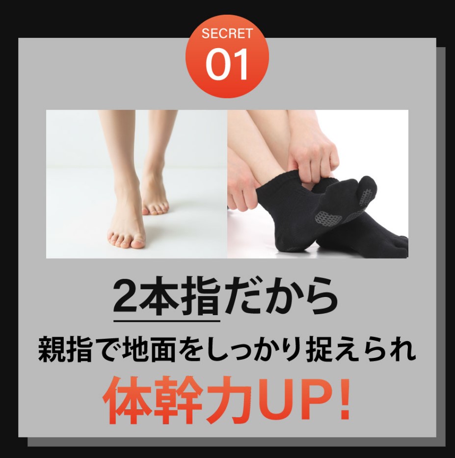 フットサポーターは特殊テーピング編みで足裏のアーチを引き上げて矯正し、2本指仕様だがら、親指で地面を捉えられるようになり、体を支える力がアップ。