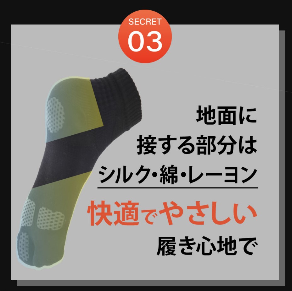 接地面の足先とかかとはシルク・綿・レーヨンを採用し、履き心地も快適。