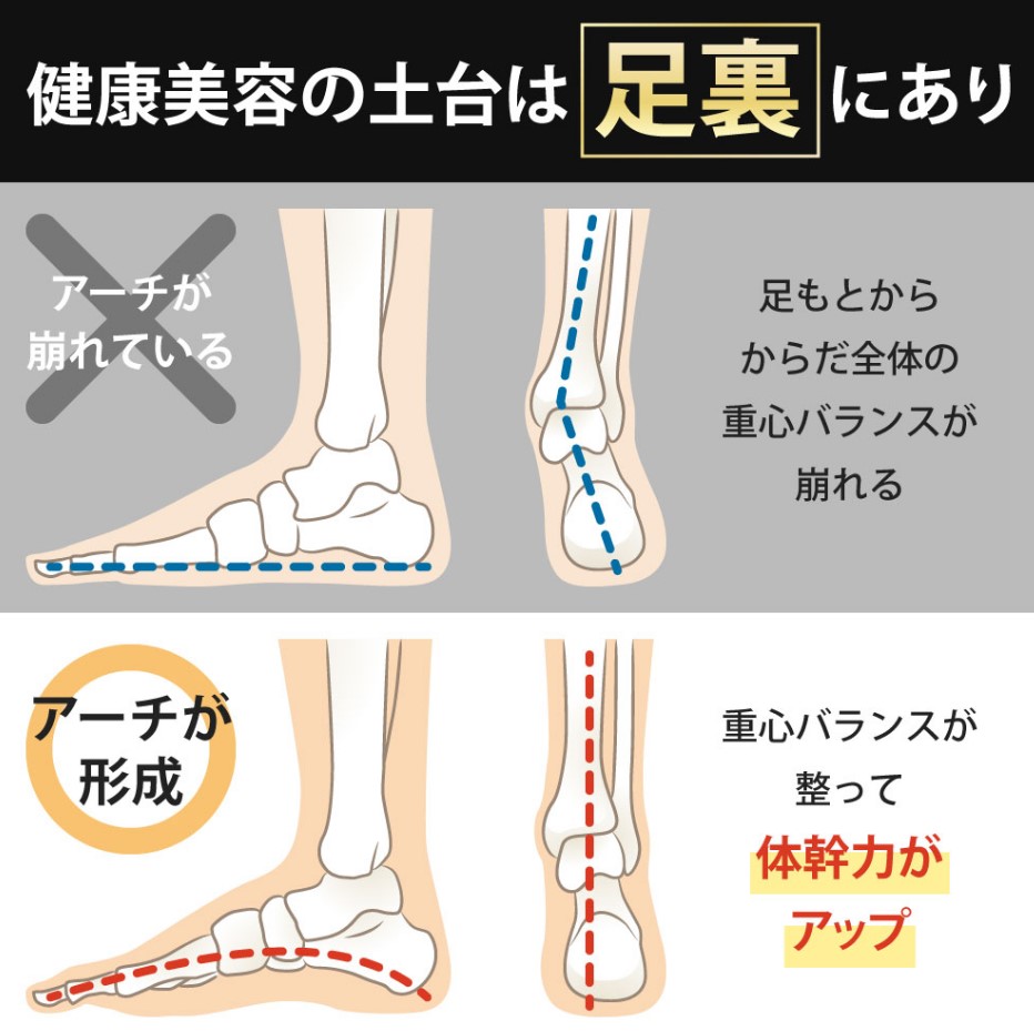 土踏まずのアーチが崩れていると、体全体のバランスが悪くなって、歩行時に踏ん張りが効きづらくなり、むくみやずん胴体形の原因にも。