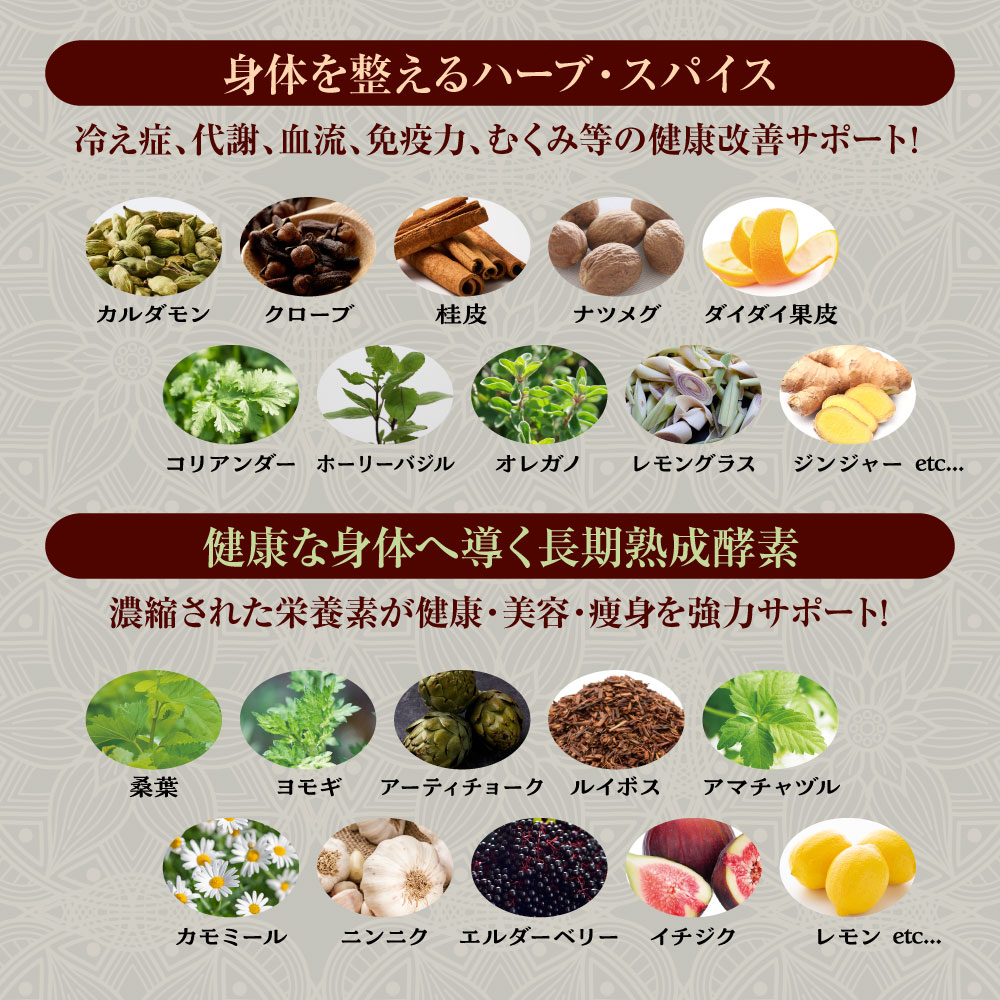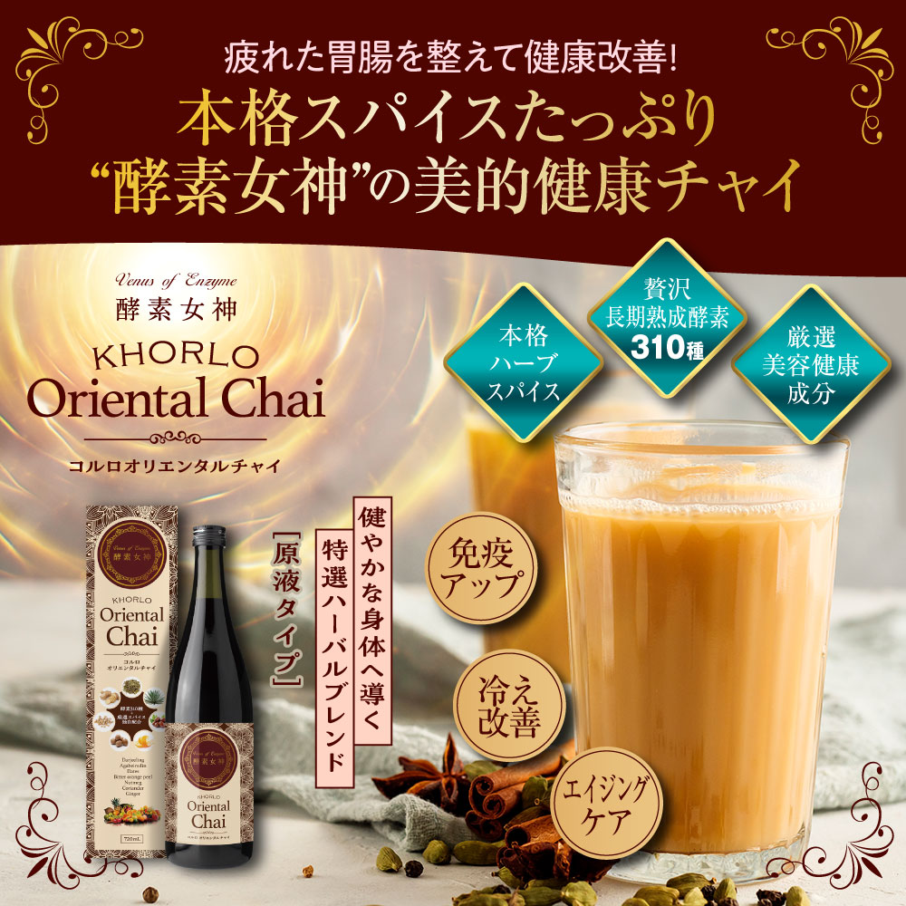 310種類の長期熟成酵素と厳選されたハーブ・スパイスが特製ハーバルブレンドされた、美容と健康をサポートする極上の美的健康チャイ