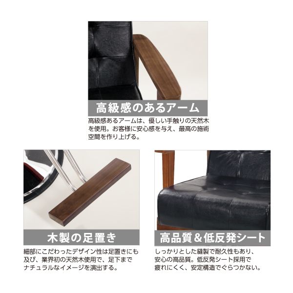 高級合成シートで汚れに強く、天然木を使ったオールドスタイルのサロンに合う、機能性スタイリングソファ。足置きも天然木仕上げの高級仕様。