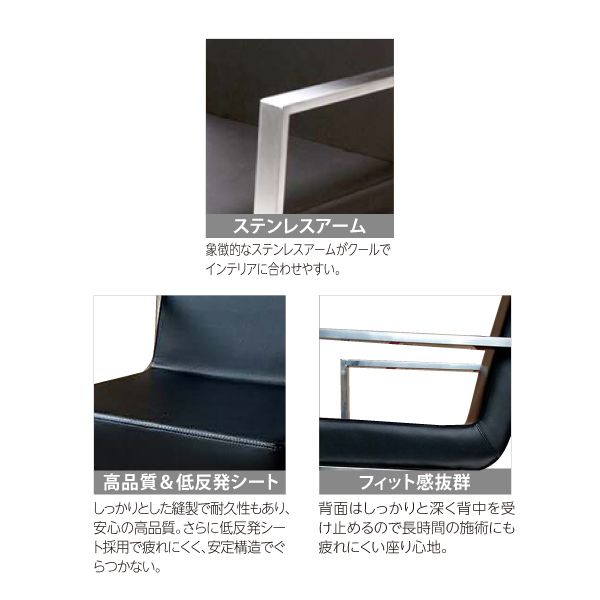 背面はしっかりと深く背中を受け止めるので長時間の施術にも疲れにくい座り心地。