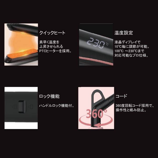 プレートは滑りやすく、クセや毛先の処理もスムーズ。340gの軽量設計と360°回転コードで取り回しも◎。