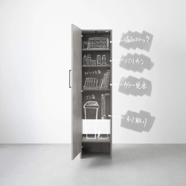 ・棚は可動式のため、高さや段数を調整することで大きめのごみ箱やちり取りも収納可能。