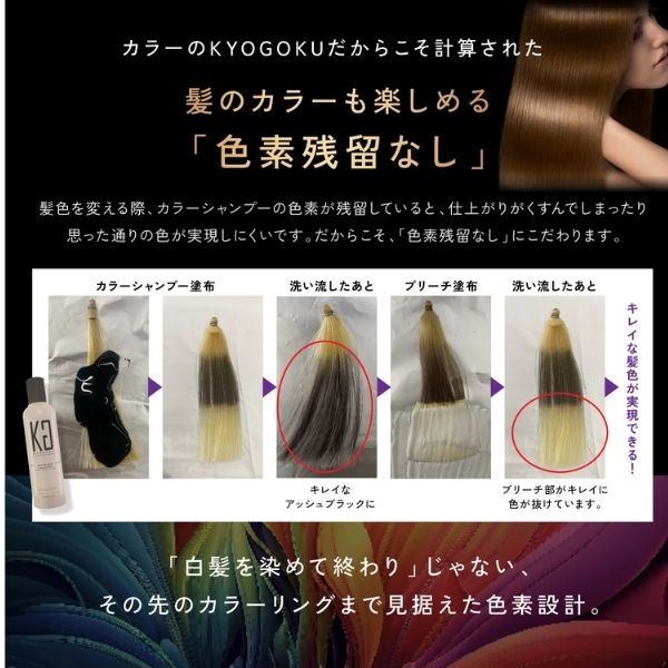 泡が密着し、髪表面にしっかり着色。ツヤを与える仕上がり。次の髪のカラーも楽しめる「色素残留なし」