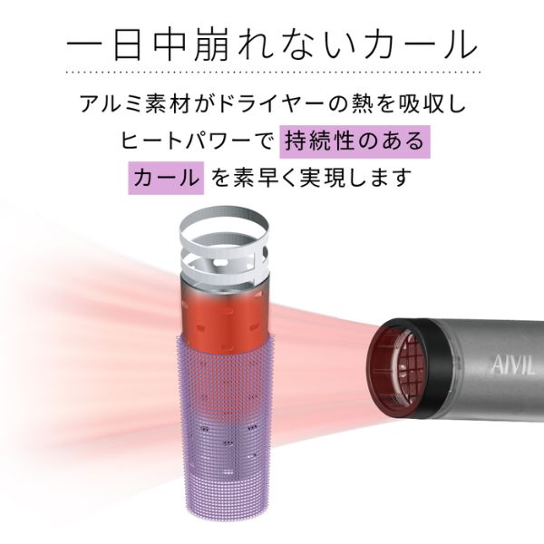 アルミ素材がドライヤーの熱を吸収し、ヒートパワーで持続性のあるカールを素早く実現。一日中崩れないカールに。