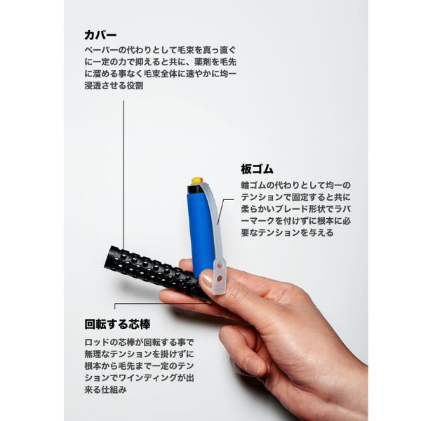 エバロッド、ペーパー、輪ゴム、スティックが一体化した次世代パーマ用ロッド。