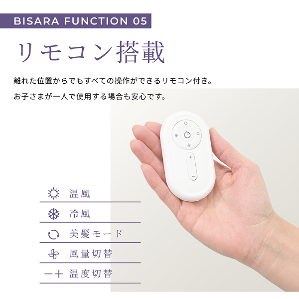 美髪モード、風量や温度の調節、電源のON/OFFをリモコンで設定可能。お子様が座った状態でも簡単に操作ができ、リモコンを使用しない場合は本体に収納可能。