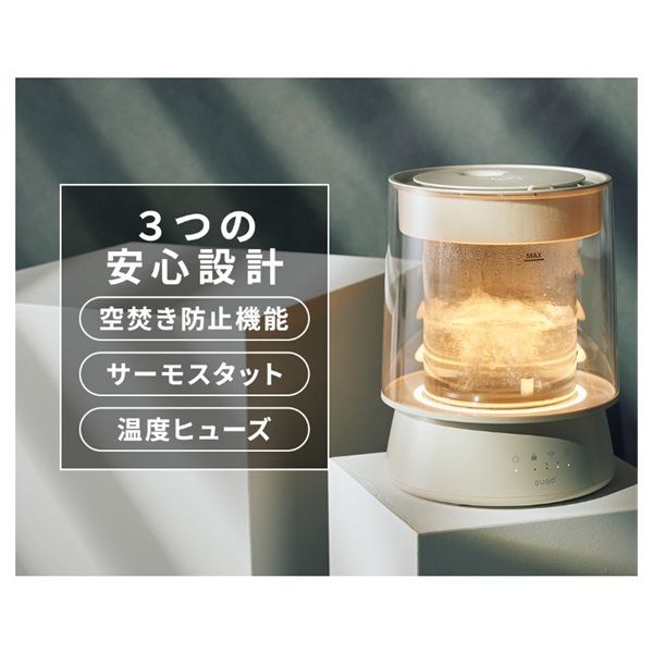 一般的な加湿器のように内部洗浄が難しくカビや細菌が繁殖する心配が少なく、清潔に保てる。さらに耐久・耐熱のガラス製で、丈夫で長持ちする。