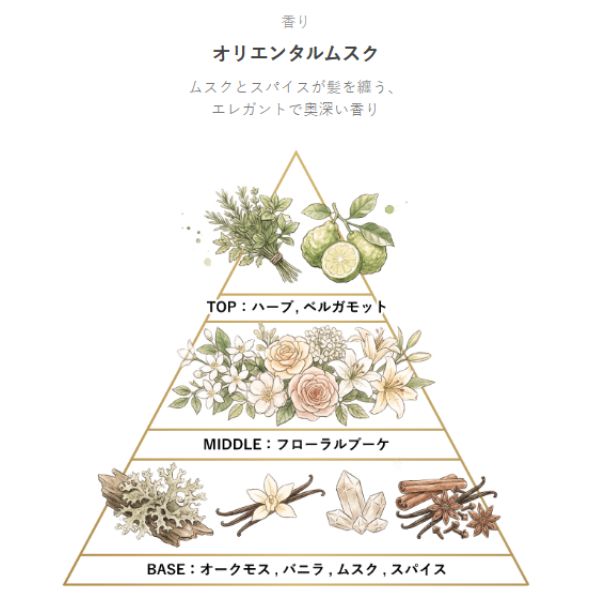 ムスクとスパイスが髪を纏う、奥深くエレガントな香り。
