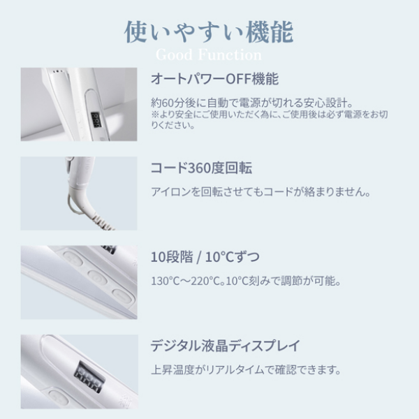 電源ONから約20秒で180℃に到達。忙しい朝のスタイリングを時短。
