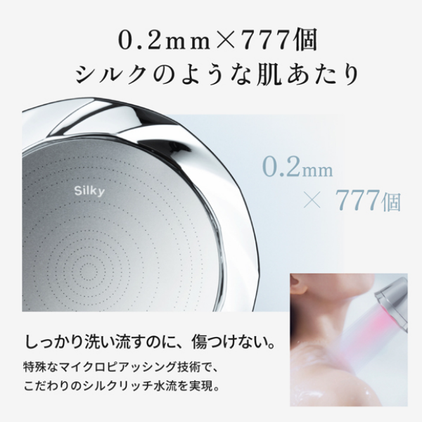 日本製プレートのやさしい肌あたりと、繊細なバブルの節水シャワーで、毎日の美容ケアを。 0.2mm×777個の極小ホールを、特殊なマイクロピアッシング技術で精密に加工。 まるでシルクのようなやさしい肌あたりと、しっかりとした洗い上がりを実現
