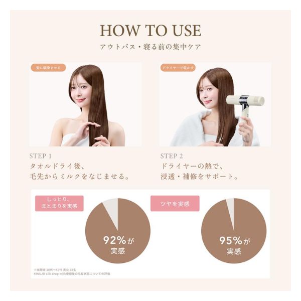 ※2:自社調べ 調査機関:新潟県技術支援センター、60°Cで加熱乾燥試験した蒸散量(塗布なし55mg/ミルク120mg)の比較。蒸散量は乾燥前に髪が抱えていた水分量の指標です。