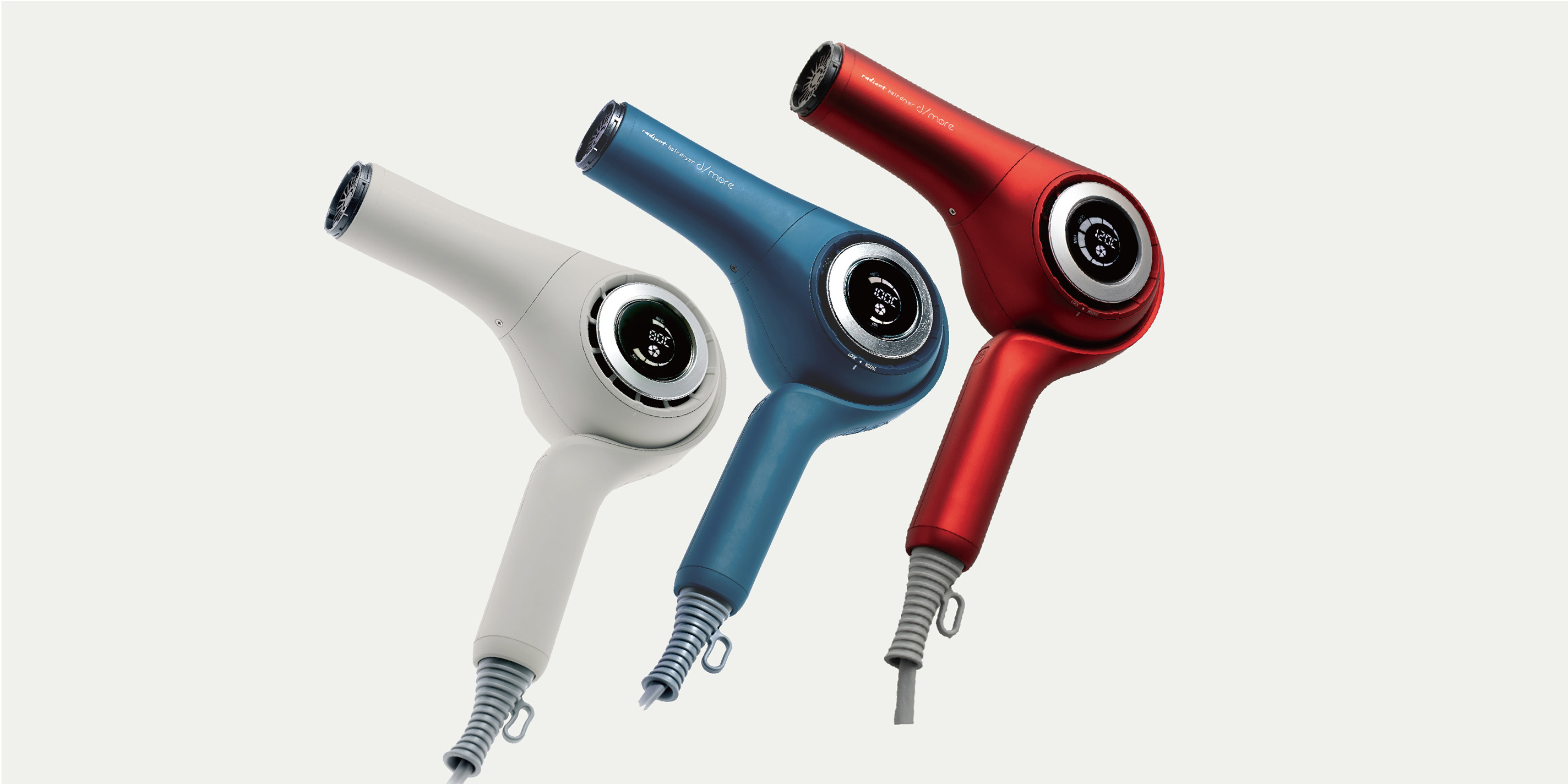 大好評のヘアアイロン radiant より、5年の試行錯誤を繰り返し、ようやく、超速乾を追及しトルクフルな温風を実現したヘアドライヤーの『d/more』が誕生しました。ドライヤーの一番の悩みである乾かすのに時間がかかる難点を圧倒的大風量で解決。 プロのヘアパーツモデルさんも大絶賛の風量にこだわったドライヤーです。